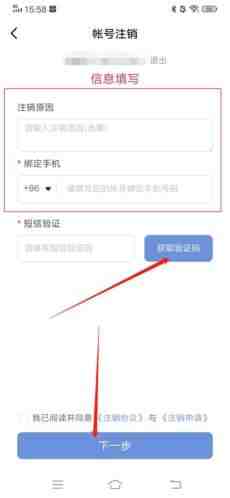 4、输(shu)入注销原因以及注册手机号,并将获(huo)取的短信验证码输(shu)入进去,勾选我同意后點击“下一步”;