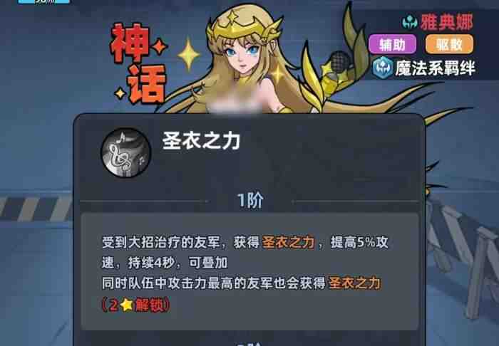 由此可以(keyi)发现,雅典娜更偏向为队友提供治疗增益,且她的治疗并非只是单纯的回血,在高星之后还能让队友在回血的同时获得额外(wai)的(de)增益效果。同时,由于雅典娜的治疗倍率非常夸张,所以即便在低星情况下,她也能轻松保住队友,让队伍获得很不错的续航能力(nengli)。目前雅典娜更适合与其它的魔法系幸存者或神圣系幸存者一同上阵,通过触发魔法系羁绊,令队伍整体的伤害得(de)到提升,因此也是(Too)魔法体系队中不可获取的幸存者。