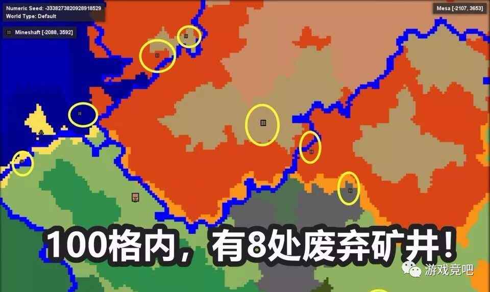 不仅仅是地面有着如此罕见的地形结构。在地下,我叫Minecraft也發現了一个令我异常吃惊的情况。利用地图查看下加载种子后,在短短的100格内,發現了八座废弃矿井结构!