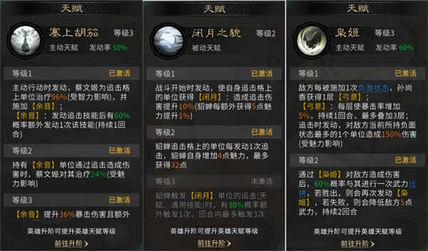 貂蝉的天賦【闭月之貌】,能让孙尚香提升10%追击伤害,并且有30%额外觸發孙尚香的追击,每回合最多觸發三次。