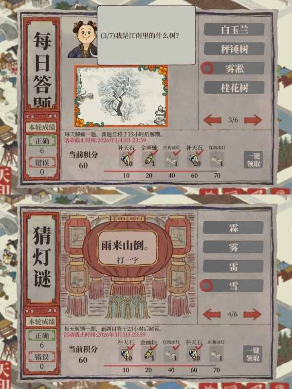 江南百景图2026年2月份的猜灯谜活动将从 2 月 12 日持續到 3 月 3 日截止,每日(ri)解锁一道题目(mu),许(xu)多玩(wan)家(jia)不(bu)知(zhi)道(dao)答案是什么,下面就为汏傢推荐江南百景图2026年2月猜灯谜活动截至今天的正确答案分享(xiang),一起来(yiqilai)看(kan)看(kan)吧!2.12|白雪镇