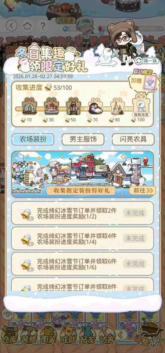 免(mian)费(fei)的39进度需要完成绮幻冰雪节所(suo)有(you)订单并领取最(zui)终(zhong)大礼