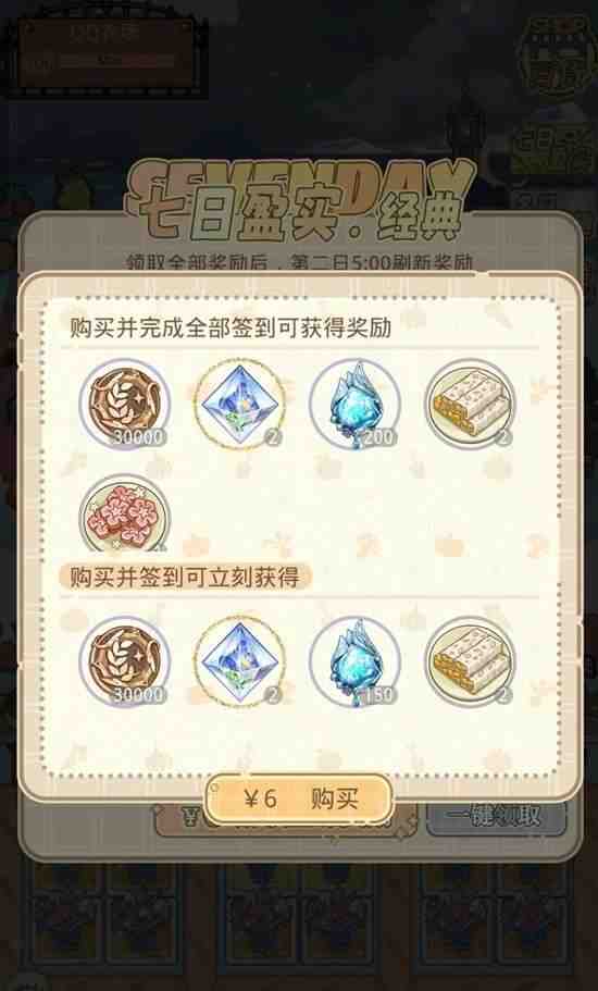 在七日盈实处氪6r,签到7天可得200雨露+2北极星+2能量棒+1鲜花饼+3万农场币