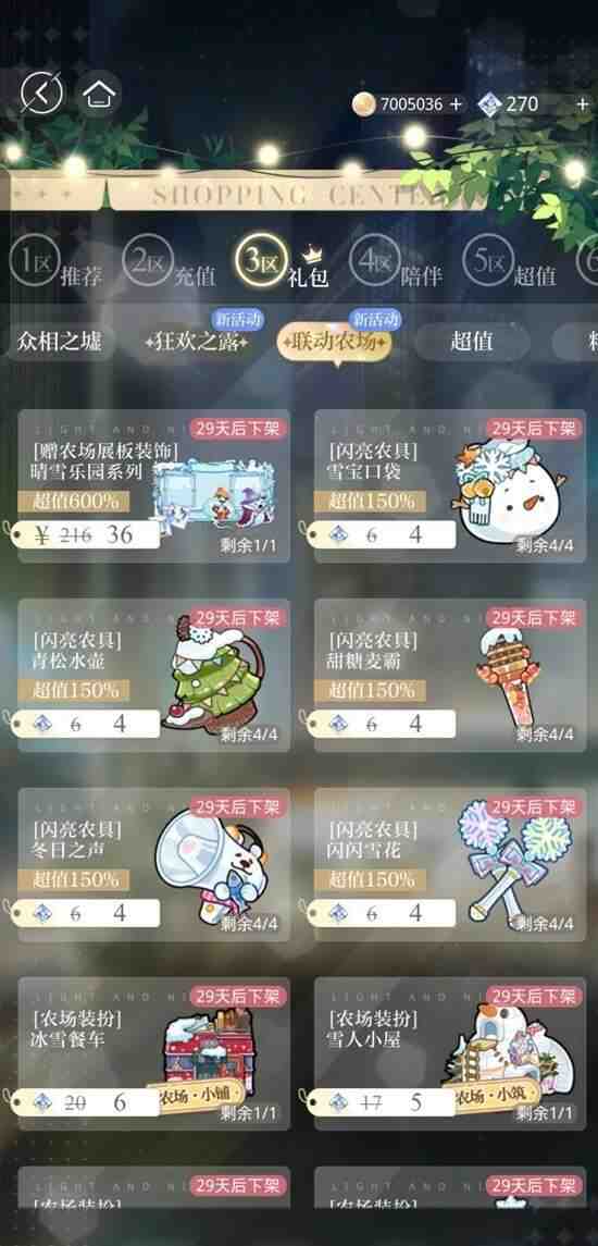 限定农具:百货 120雨露/件,购物3区礼包-联动农场 4北极星/件