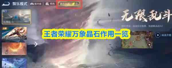 王者荣耀万象晶石主要用于娱乐模式中的选将阶段,在火焰山、契约之战、梦境大乱斗等中使用可以自选英雄。万象晶石主要通过钻石兑换、娱乐模式对局获得、完成任务获得。下面是王者荣耀万象晶石作用一览!