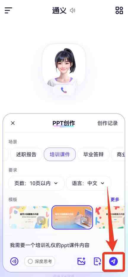 2、选择PPT使用的场景、页数和语言要求以及模板,也可以在输入框内输入更加(more)详(xiang)细的要求和PPT主(zhu)题(ti)。全部输入完成后點击右下角。