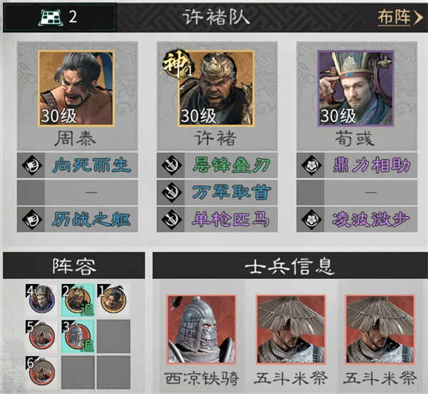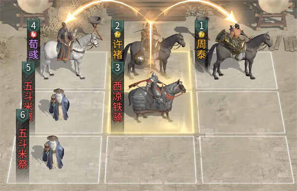 兵种站位:在许褚的下方放置1个西凉铁骑,在荀彧的下方放置2个五斗米祭。