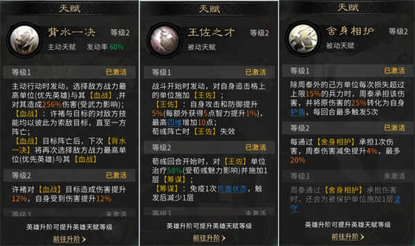 周泰的天赋【舍身相护】可为队友承担伤害,显著增强整(zheng)体(ti)生存能力,为许褚创造稳定的输出环境,让许褚在【血战】中能够更加轻易地击败敌方武将。