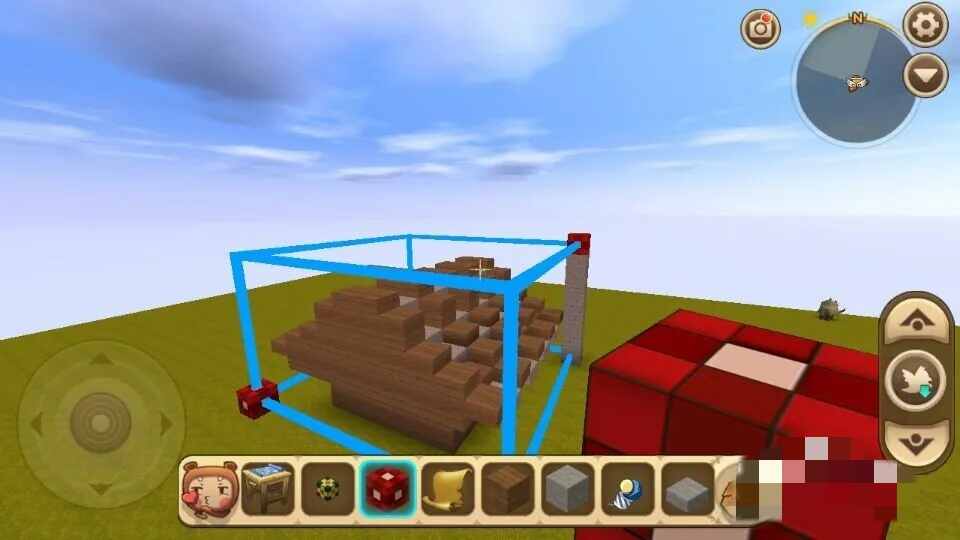 在另一边也放区域复制方块,注意(zhuyi),要在下面垫方块,就会出现蓝色的线,围成方体,上面不(bu)能低于想复制的建筑(zhu),不然房盖会有(there will be)缺陷。操作如图。