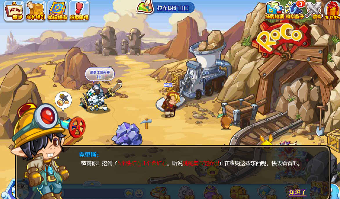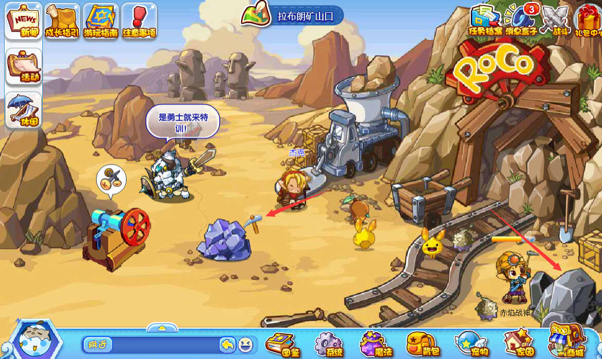 2、矿石阔以在拉布朗矿山口前进采集,点击红色箭头所指地(di)点(dian),只要等待一段时间就(jiu)可(ke)以(yi)取得矿石。