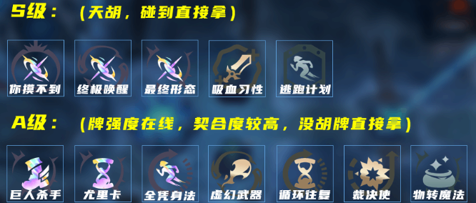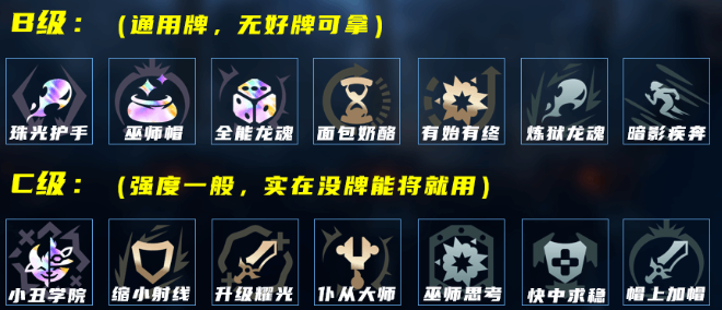 B级(通用牌,无好牌可晕): 珠光护手、巫师帽、全能龙魂、面包奶酪、有始有终、炼狱龙魂、暗影疾奔。
