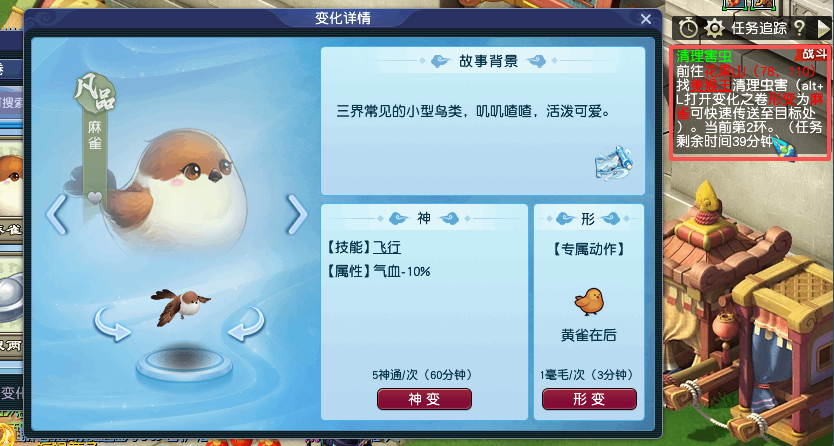 在环任务过程中,部分任务会触发(trigger)彩蛋,使用“变化之卷”中指定形变可快速到达目标处,建议(yi)各位(gewei)少侠提前解锁并收藏“麻雀”和“蝴蝶”形变哦!