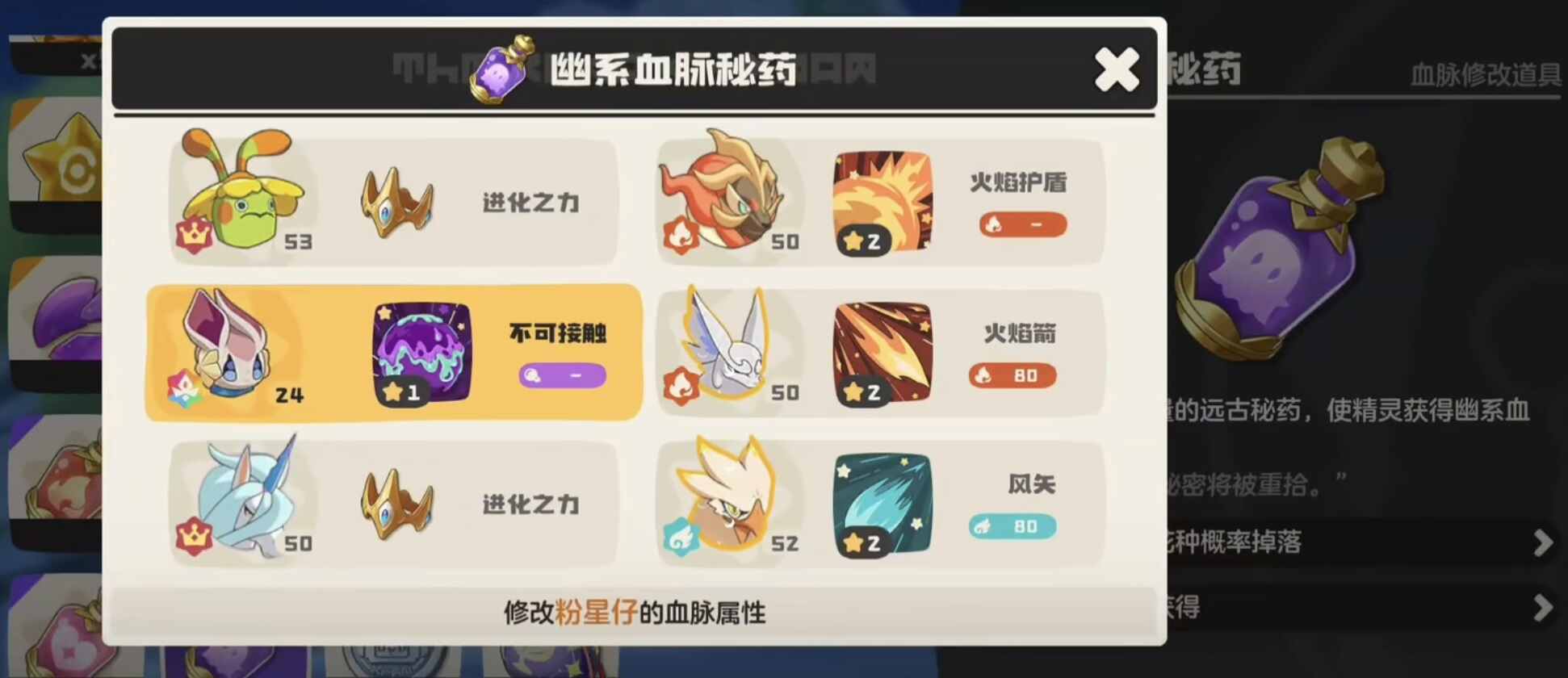 捕获后,需将粉星仔培养至32级。随后前往炼金釜,合成幽系灵碎:消耗3个幽系粉尘与1个任意其他属性灵碎即可完成制作。下一步是炼制幽系血脉药,配方为10个幽系灵碎加1个任意属性血脉药,合成成功(chenggong)后可在背包中直接使用。使用时需选定已培养好的粉星仔,连续两次确认操作(zuo),完成血脉更替——此时粉星仔即获得幽系血脉,为超进化奠定必要条件。