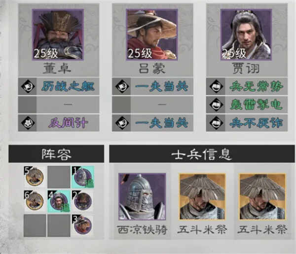 兵种(Arms)站位:董卓上方放置一名西凉铁骑,阵容第一行以及第二(dier)行末尾均放置一名五斗米祭。