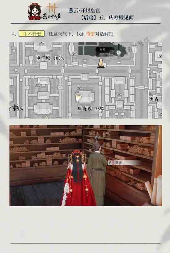 燕云十六声庆寿殿5个见闻指南共5 个见闻,含掌风吹拂、毋得进、奉圣节诸庆、乐礼重兴、手不释卷。需完成探游、与 NPC 对话、拾取物品解锁,搭配筑梦为牢万事知任务。完成可领剑纹、宝箱、阅历等奖励,小编为你准备了一份攻略,各位朋友们快来看看吧。