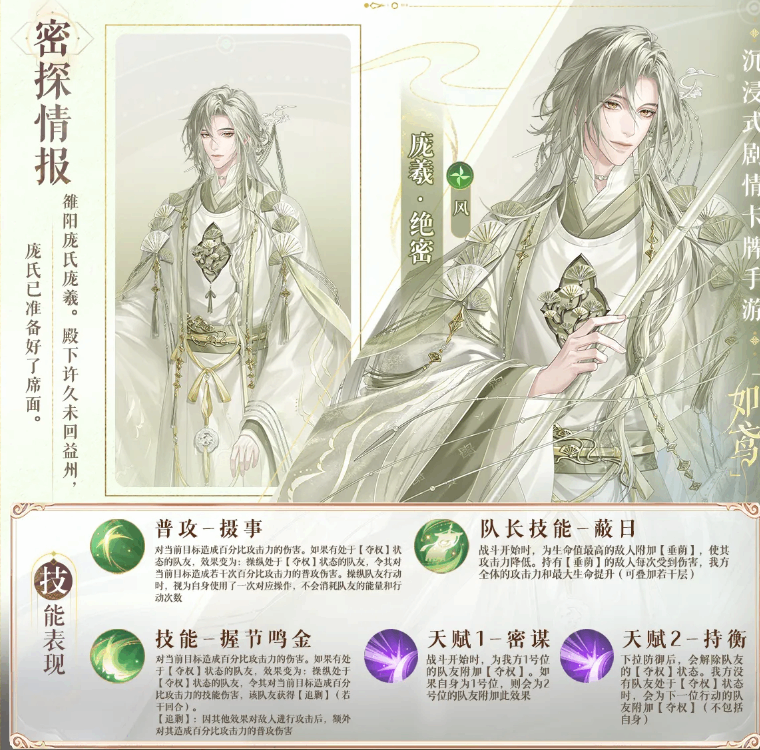 以上就是(that is)游戏的简单介绍(shao),而大(da)家对即将出现奖池的庞羲不了到时抽不抽。接下来小编来给大(da)家一个建议,庞羲做为辅助密探,操作围绕着夺权。夺权就是(that is)可以操控夺权状态的队友,使其进行额外的普攻或技能(skill)。可以使队伍节奏变得流畅,大(da)家可以根据(ju)自己的情况来决定抽取。