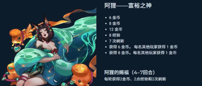 经济型阵容(line-up):选择阿狸,可获得(available)金币、经验及免费刷新次数,适合(Suitable)快速升级和追高费卡。