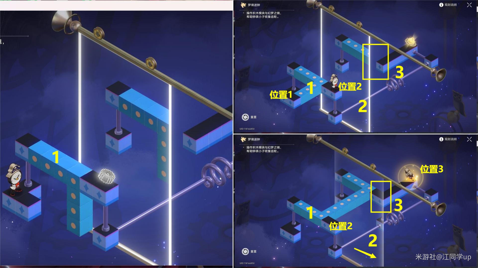 (2)将1蓝色模块点(dian)击(ji)旋转2次,将2镜子往右下移动(move),使3位置拼接到一块,【钟表小子】会从位置2到位置3,解密完成(wancheng)